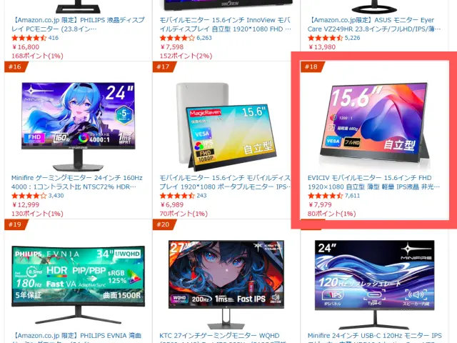 特に、15.6インチ・フルHDの「EVC-1506」やその後継モデルは、EVICIVを代表するシリーズで、Amazonのディスプレイ全体の売れ筋ランキングでも頻繁に上位にランクインしています。