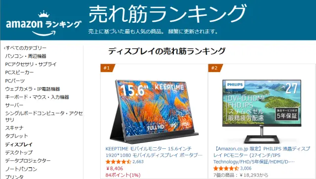 Amazonのディスプレイ全体の売れ筋ランキングで1位をキープし続けている、大人気のモバイルモニターです。8000円台のお手頃さでコスパの高さも魅力です。