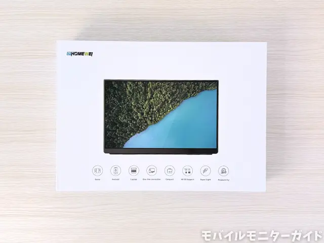 外箱は、強度がありしっかりしています。モバイルモニターのイメージが描かれたシンプルなデザインで、EHOMEWEIのロゴも入っています。
