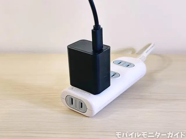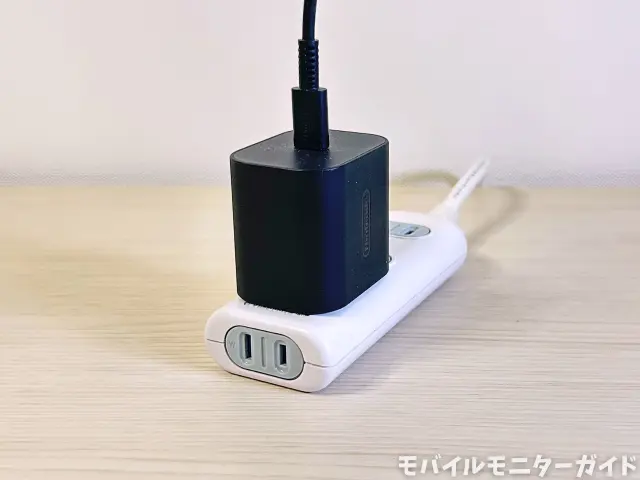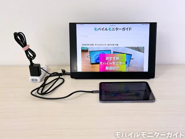 USB-C接続では、ノートPCからモバイルモニターに映像信号と共に電力も送られるため、モニターに電源を挿さなくてもケーブル1本で使えて便利です。