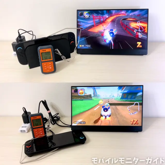 同じ条件で長時間マリオカートをプレイして、Switch 2の排気口の温度を測定してみたところ、ドック経由では52℃、USB-C接続では53℃となり、ほとんど変わりませんでした。