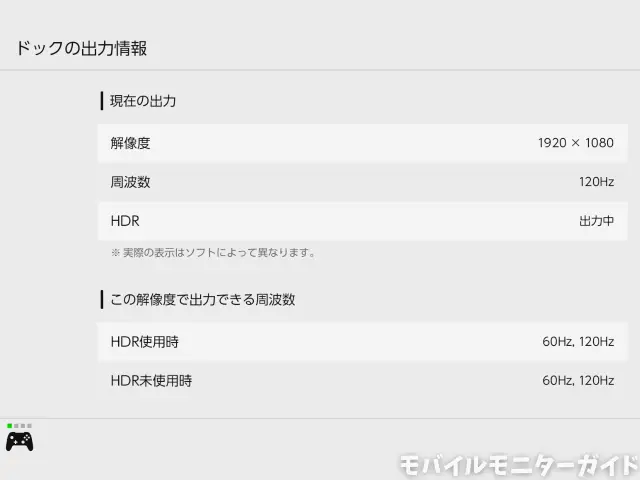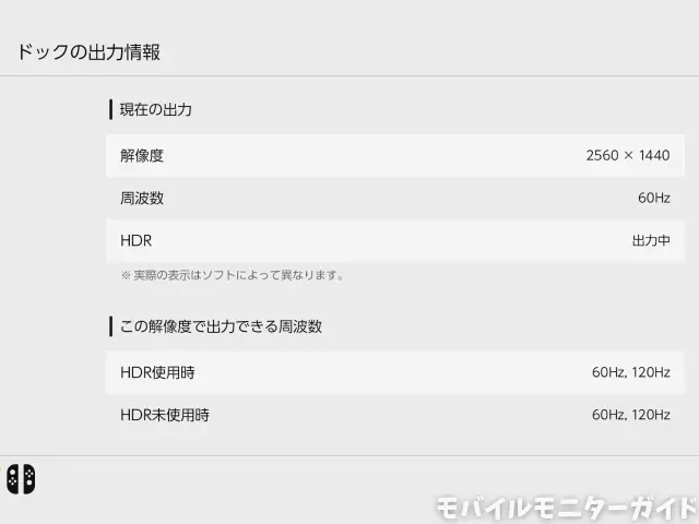 続いて、Switch 2と接続したときの映像スペック(解像度・リフレッシュレート・HDR)を確認します。