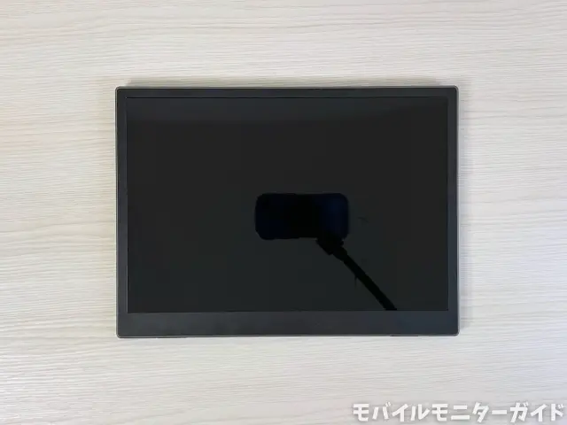 液晶は光沢のIPSパネルで、写真や映像を綺麗に楽しめます。ただし、周囲の風景や照明が映り込みやすく、上の写真でも撮影用カメラが映り込んでいます。