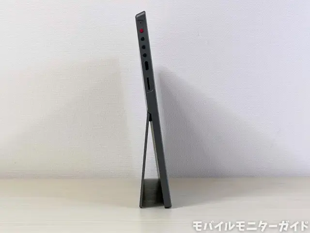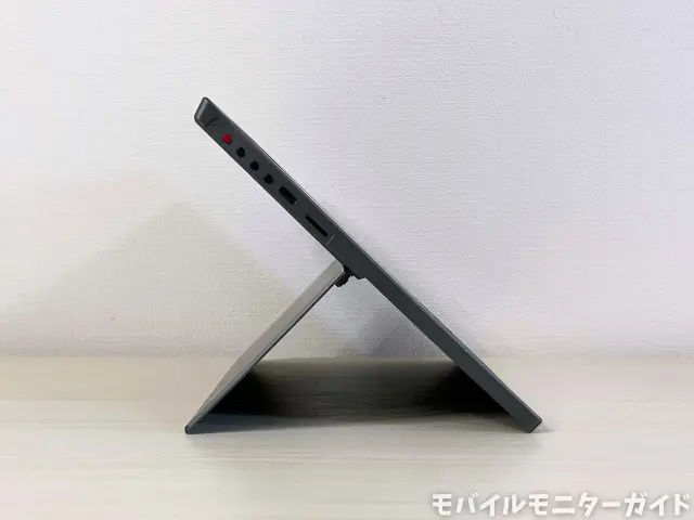 スタンドを使うとモニターを好きな角度で立てかけられます。こちらは垂直に近い角度で立てかけた様子です。