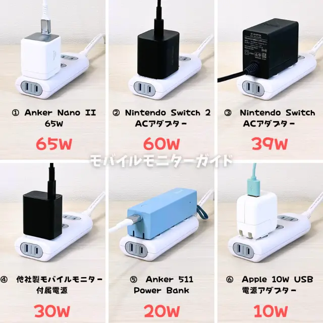 Switch 2の純正電源以外でしたら、おすすめは「Anker Nano II 65W」です。65Wの高出力で、Switch 2やノートPCを充電しながらモバイルモニターを使う場合も安定して使えます。