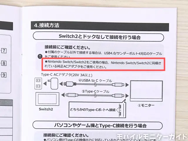 やはり、取扱説明書で推奨されているSwitch 2の純正電源など、高出力な電源を使っておくと安心です。