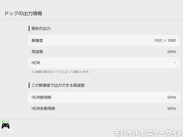 続いて、Switch 2と接続したときの映像スペック(解像度・リフレッシュレート・HDR)を確認します。