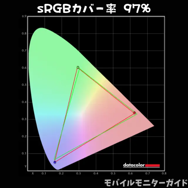 その結果、sRGBカバー率は97%でした。測定誤差も考慮すると、ほとんど100%と考えて良いでしょう。