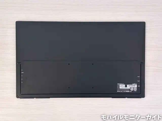 モニタアーム用のネジ穴が4つと、自立スタンドがあります。モニタアームを装着すれば据え置きモニターとしても使えますね。