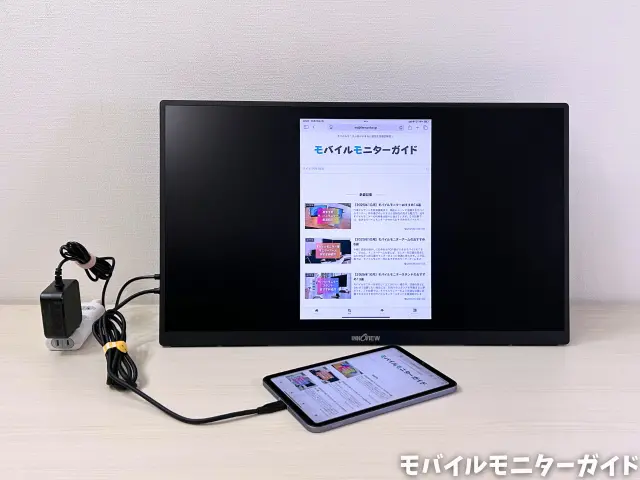 付属の電源アダプターをモニターにつないだ状態で、付属のUSB-Cケーブルを使って接続すると、iPad miniの映像がモニターに映りました。