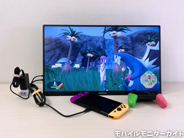 付属の電源アダプターをモニターにつないだ状態で、付属のUSB-Cケーブルを使って接続すると、Switchの映像が映りました。
