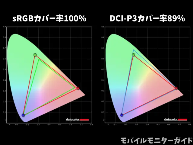 その結果、sRGBカバー率100%、DCI-P3カバー率89%と、数値をみても高画質であることが分かりました。