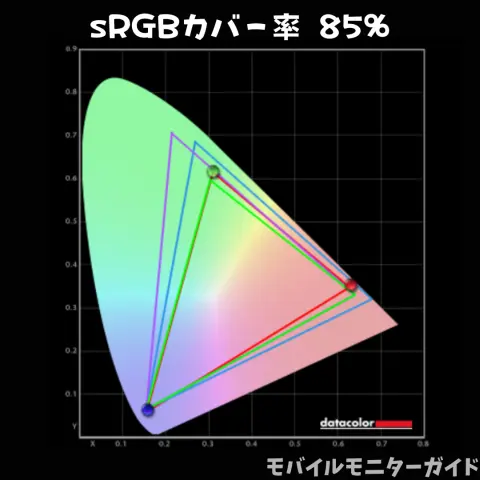 キャリブレーションセンサーで測定した結果、sRGBカバー率は85%でした。モバイルモニターとしては綺麗なほうです。