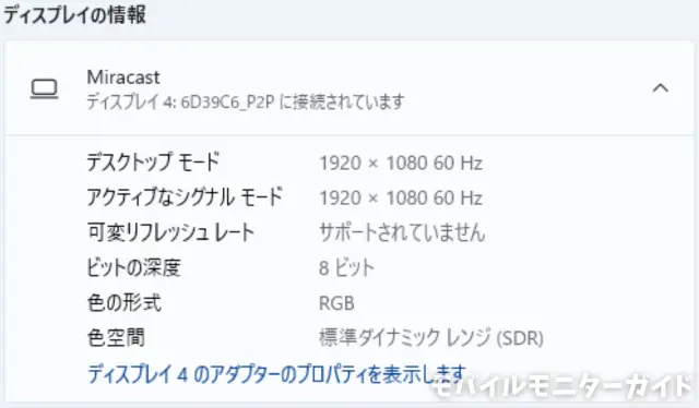 Windowsでディスプレイの設定で映像スペックを確認してみると、フルHD・60Hzでした。一般的なモニターに接続した時と同じ映像スペックが出せていました