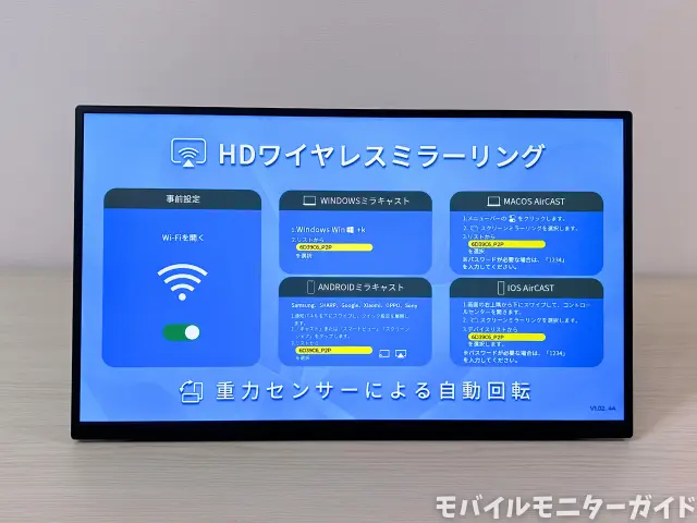 P156AHBWは、電源ボタンを押してモニターを起動すると、画面にワイヤレス接続の手順が表示されます。