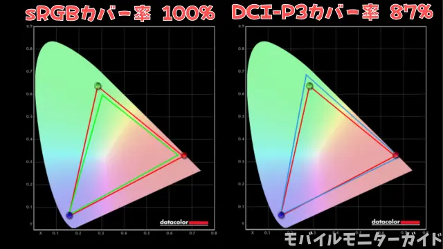 キャリブレーションセンサーで計測した結果、sRGBカバー率100%、DCI-P3カバー率87%となりました。